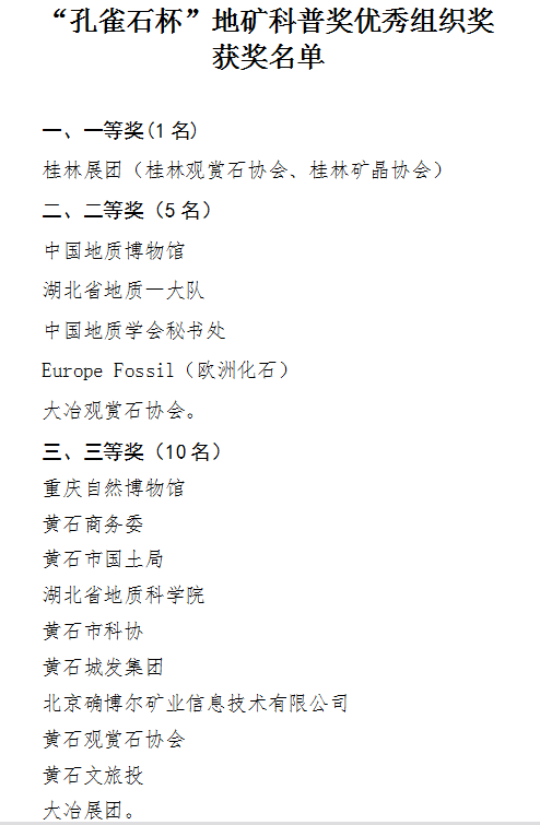 中國(黃石)地礦科普大會“孔雀石杯”地礦科普獎優(yōu)秀組織獎獲獎名單公示